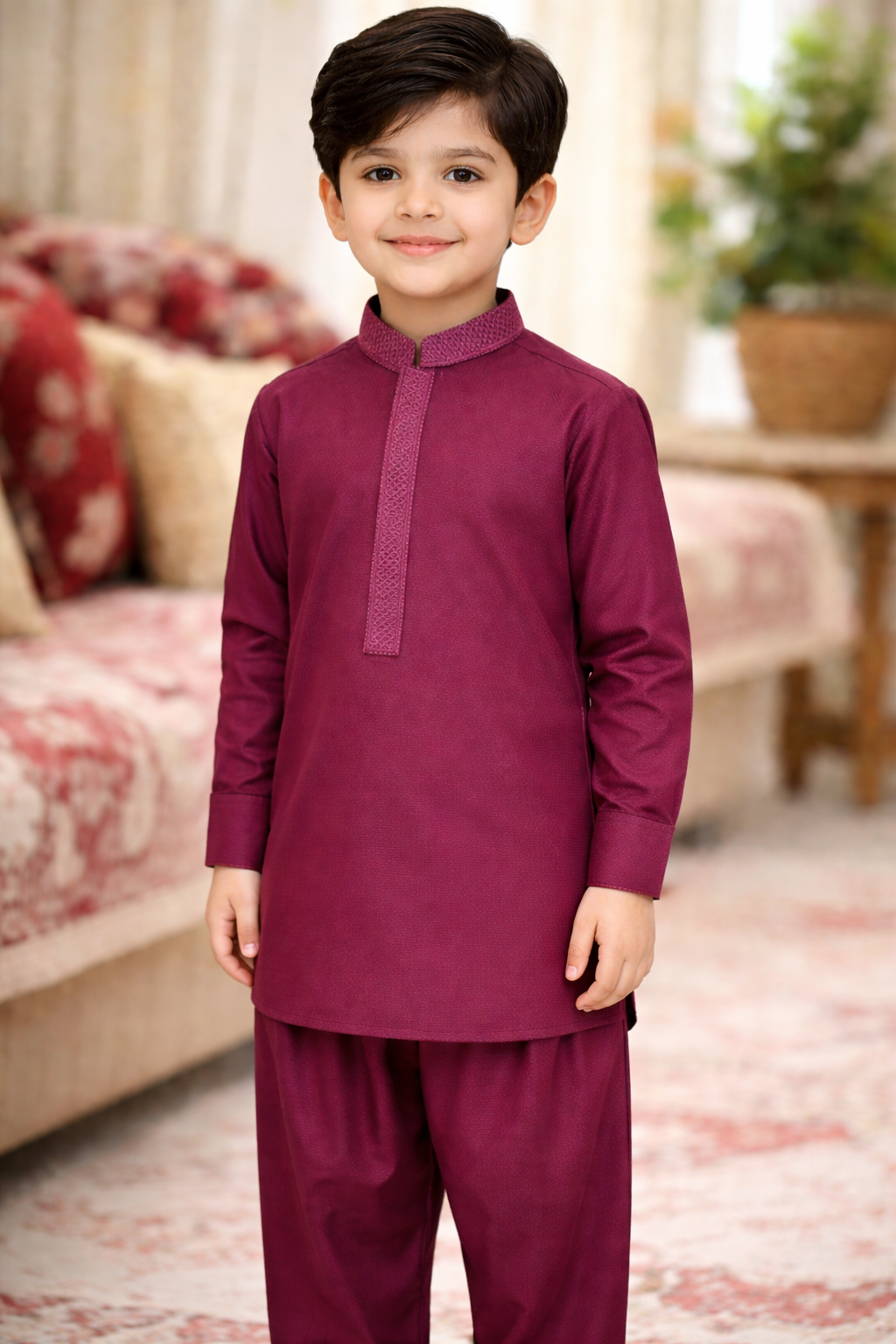 A refined festive outfit designed for little gentlemen. This premium maroon kurta Trouser features elegant embroidery on the collar and placket, crafted from soft comfortable fabric to give your child a stylish and traditional look.