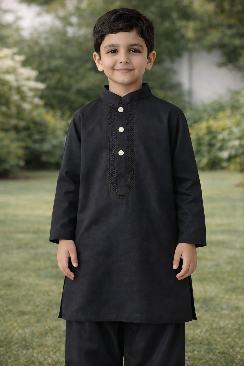 Give your little one a timeless and elegant look with the Classic Black Embroidered Kurta Trouser by Tiny Tales Wear. Designed with refined traditional detailing, this outfit features a sleek embroidered placket paired with decorative buttons that enhance its sophisticated appearance.