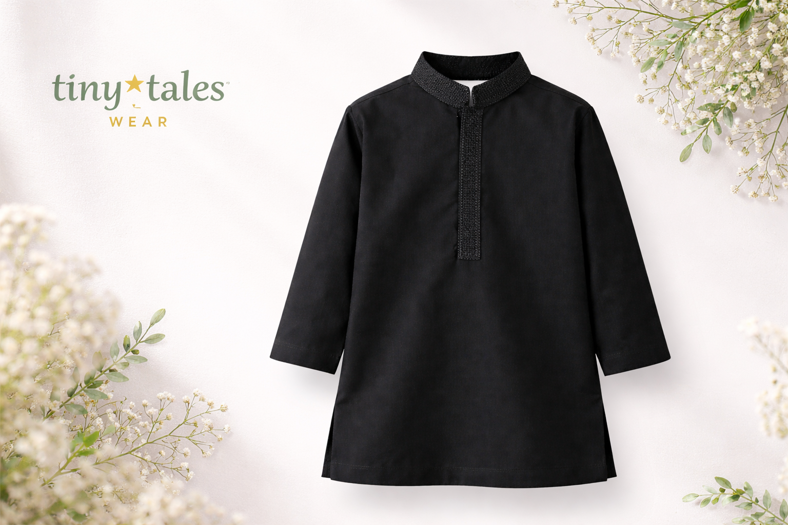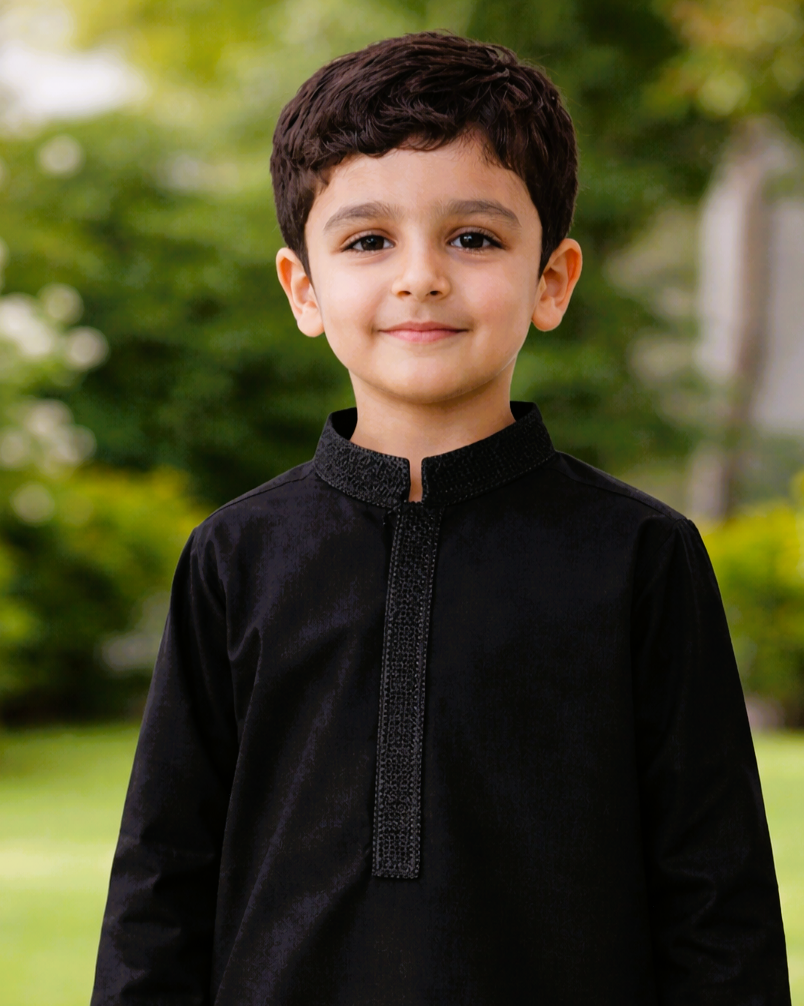 Dress your little one in timeless elegance with the Classic Black Kurta Trouser by Tiny Tales Wear. Crafted from soft, comfortable fabric with a refined embroidered placket, this outfit offers a perfect blend of tradition and modern style—ideal for Eid, weddings, family gatherings, and festive occasions.
